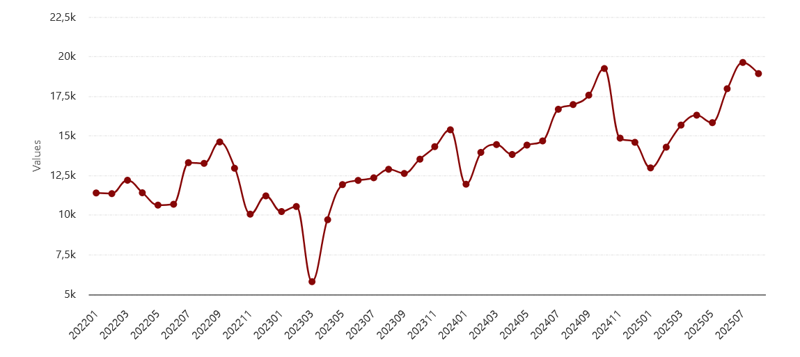 Exportações Brasileiras de Carne Bovina | Jan 2022 a Ago 2025 | TEU